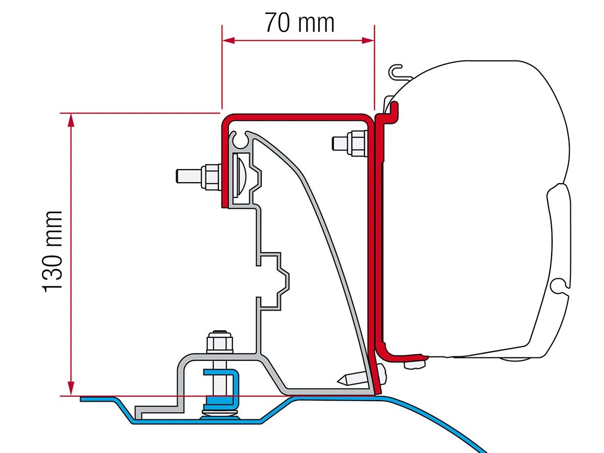 Deze adapter maakt het mogelijk om de Fiamma F45S-luifel te bevestigen aan een Fiat Ducato H2, Citroën Jumper H2 of Peugeot Boxer H2, vanaf 2006, die voorzien is van een Roof Rail.