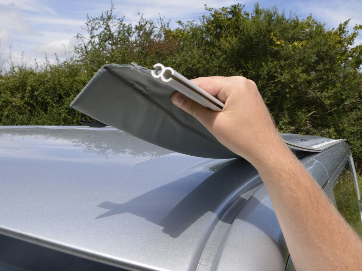 Als je geen rail of luifel aan je bus hebt zitten, kan je met deze magneetadapter je bustent tóch aan je bus vastmaken. Maak de magneet aan de bovenkant van je bus vast, schuif de meegeleverde plastic koppelstrips eraan, en je kan de pees van je bustent bevestigen. Als je weer weg wil rijden, trek je eenvoudig de koppelstrips ertussenuit of je haalt de magneetadapter van het dak.